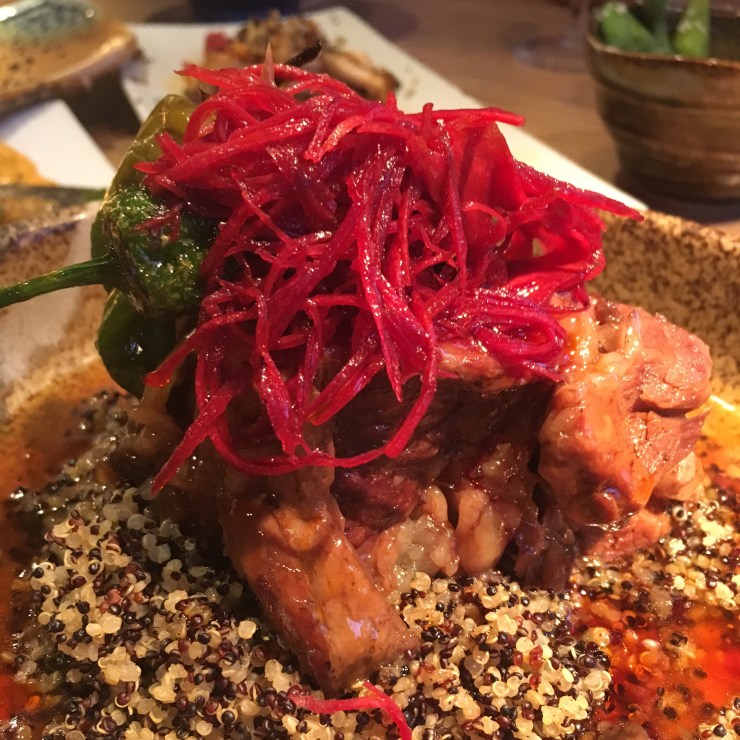 By now we were full but simply could not say no to what awaited us. Mommi’s new and highly celebrated chicken pachamanca dish came atop sweet potato, giant peruvian corn and Rocoto peppers, wish a quinoa lime picante sauce. The braised sticky short rib of beef arrived simultaneously which could easily serve as a main dish alone for anyone wanting to invest in a single plate from the a la carte menu. It was upon tucking into these two meat options that that we realised we might just have overdone it. We ploughed on though, with no complaints as the golden dish – Nikkei tempura fish and cassava chips – arrived. The fish was flaky and wrapped in a light, crunchy batter – offset perfectly by the wasabi mayo on the side for dipping. I took one for the team and polished off the cassava chips – a delicacy I indulged in almost every day on recent trips to Cuba and Colombia where cassava or yuca act as the main starch in homes and on restaurant menus.
