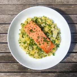 5. Leave to cool and then top with ½ a teaspoon each of crème fraiche and chopped salmon.